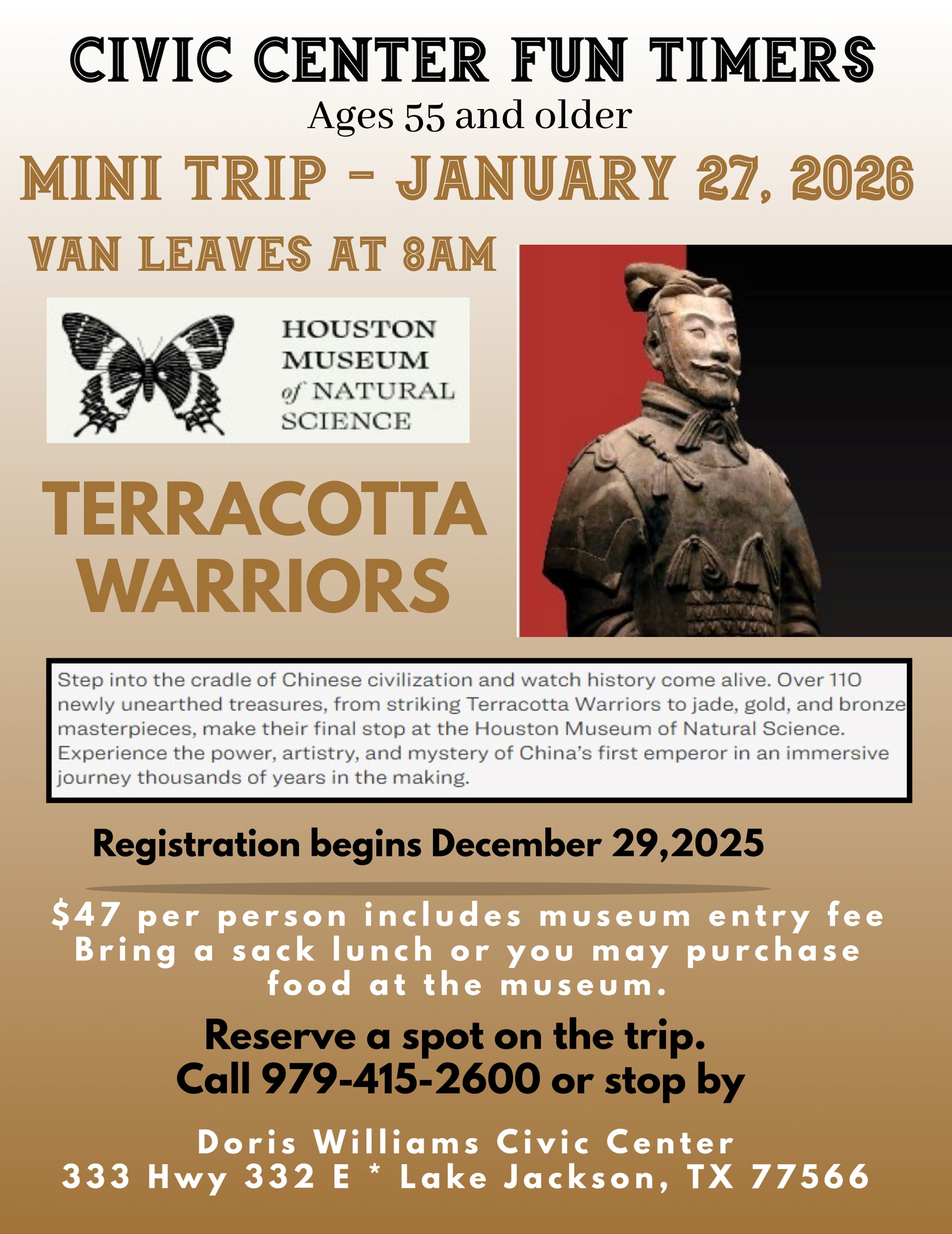 Meet at the Doris Williams Civic Center about 15 minutes prior to the designated departure time.
