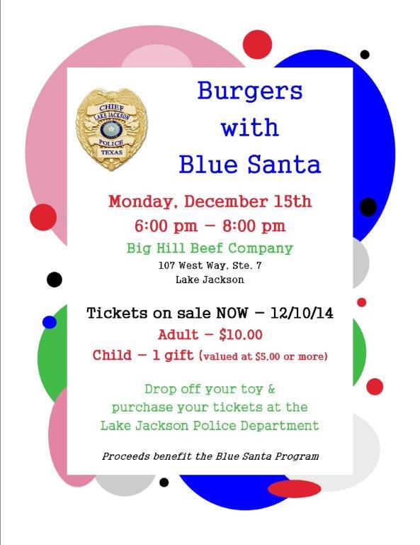 Join us for Burgers with Blue Santa on Monday, December 15th from 6:00 pm - 8:00 pm at the Big Hill Beef Company, 107 West Way, Ste 7, Lake Jackson.
